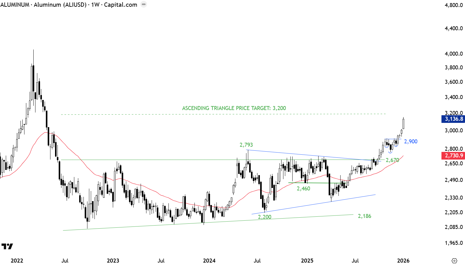 Aluminum futures completed a multi-year long ascending triangle. The upper boundary was tested several times around 2,670 levels. The symmetrical triangle inside the ascending triangle acted as a launching pattern. Long-term ascending triangle price target stands at 3,200 levels. 2,670-2,793 area becomes the support. The weekly chart shows a pullback followed by continuation of the uptrend. The pullback formed a very short-term H&S continuation chart pattern on daily scale (not shown here). The neckline of the short-term bullish continuation was breached at 2,900 levels. Breakout above the horizontal resistance is now resuming the uptrend. Price is very close to the ascending triangle pattern objective.