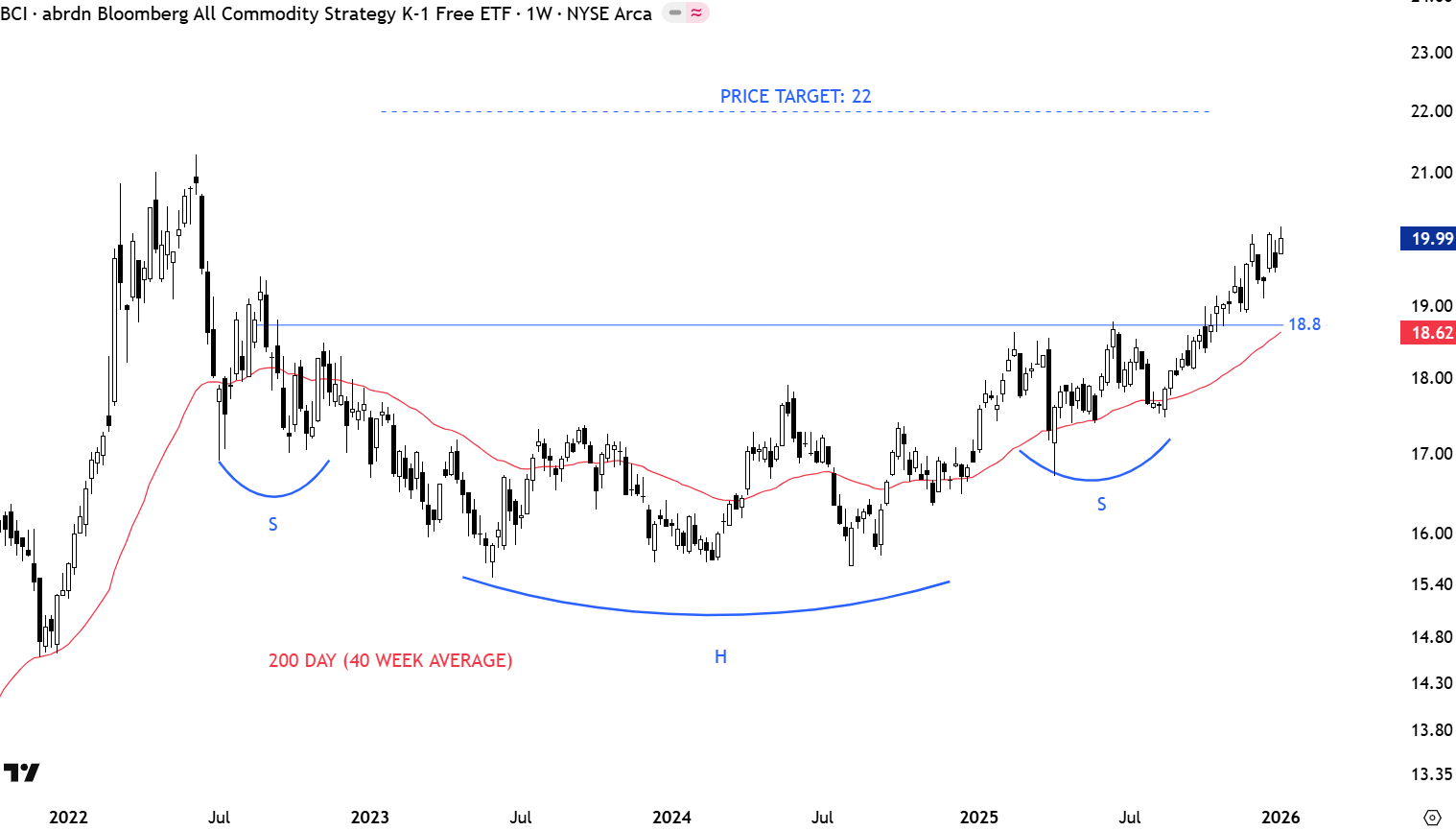 BCI is a commodity ETF tracking a broad-based index, providing exposure to various commodities like energy, metals, and agriculture, without issuing a K-1 tax form, which simplifies tax reporting. Its performance is tied to commodity market trends, which can be influenced by global economic conditions, inflation, and supply-demand dynamics. Over the past few days the unadjusted chart shoed a sginficant gap and drop due to large dividend. The dividend adjusted chart is not impacted and continues to support the bottom reversal case. When a dividend is paid and the unadjusted chart shows a sharp price drop, it is actually not a loss in a portfolio as the investor is compensated by either shares or cash dividend to make up for the change in price. The chart is possibly completing a 2 year-long bottom reversal that can be identified as a complex H&S bottom. The neckline is at 18.8 levels. It is important to note that completion of the multi-year long bottom can be the beginning of a longer-term uptrend in commodities. 18.5-18.8 area turns into support. Price target for the bottom reversal stands at 22 levels.
