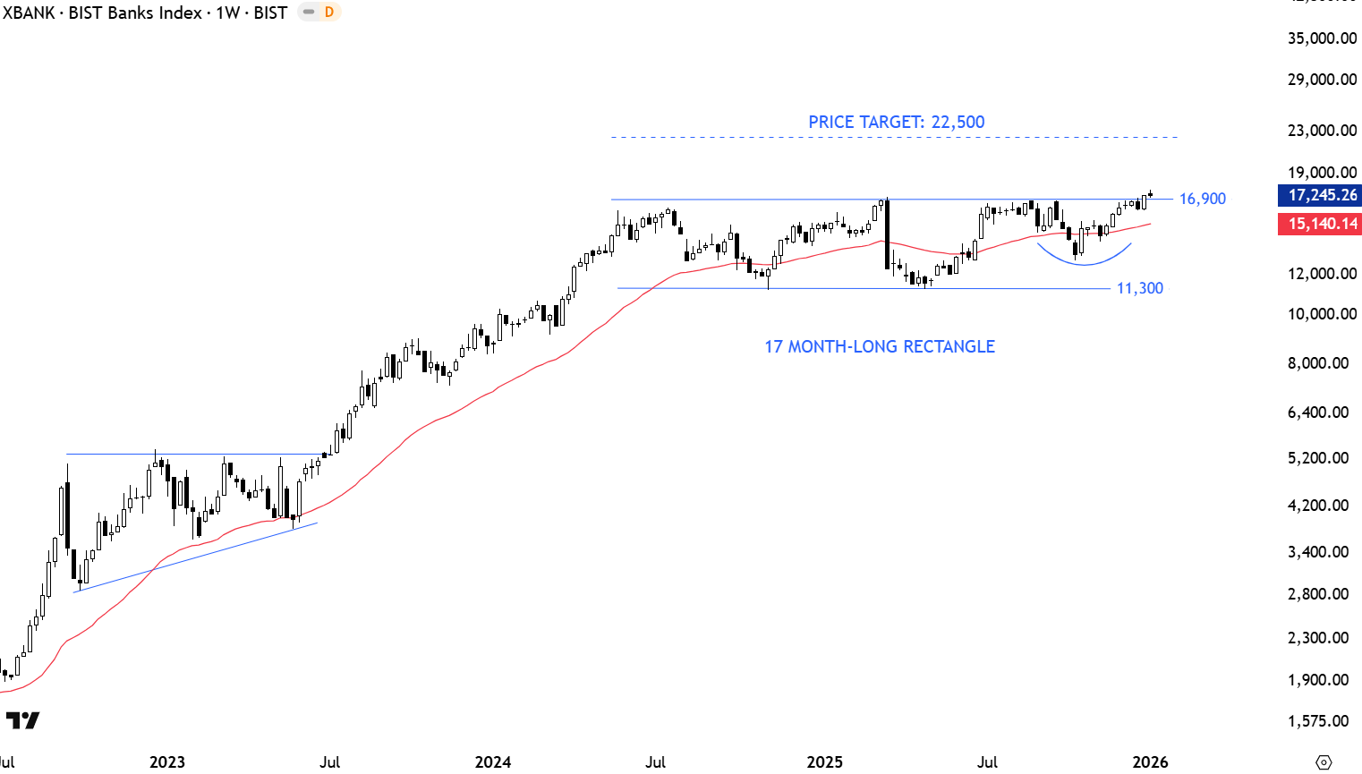 Banking Index stabilized above the year-long average. Multi-month long rectangle price target stands at 22,500 levels. Strength in Banks can be the driver of equity market performance on BIST100. Breakout confirmation needs a strong weekly close that clears the multi-month long consolidation. Such price action can possibly launch multi-month long uptrend. We still haven’t seen that strong breakout on the Banking Index.