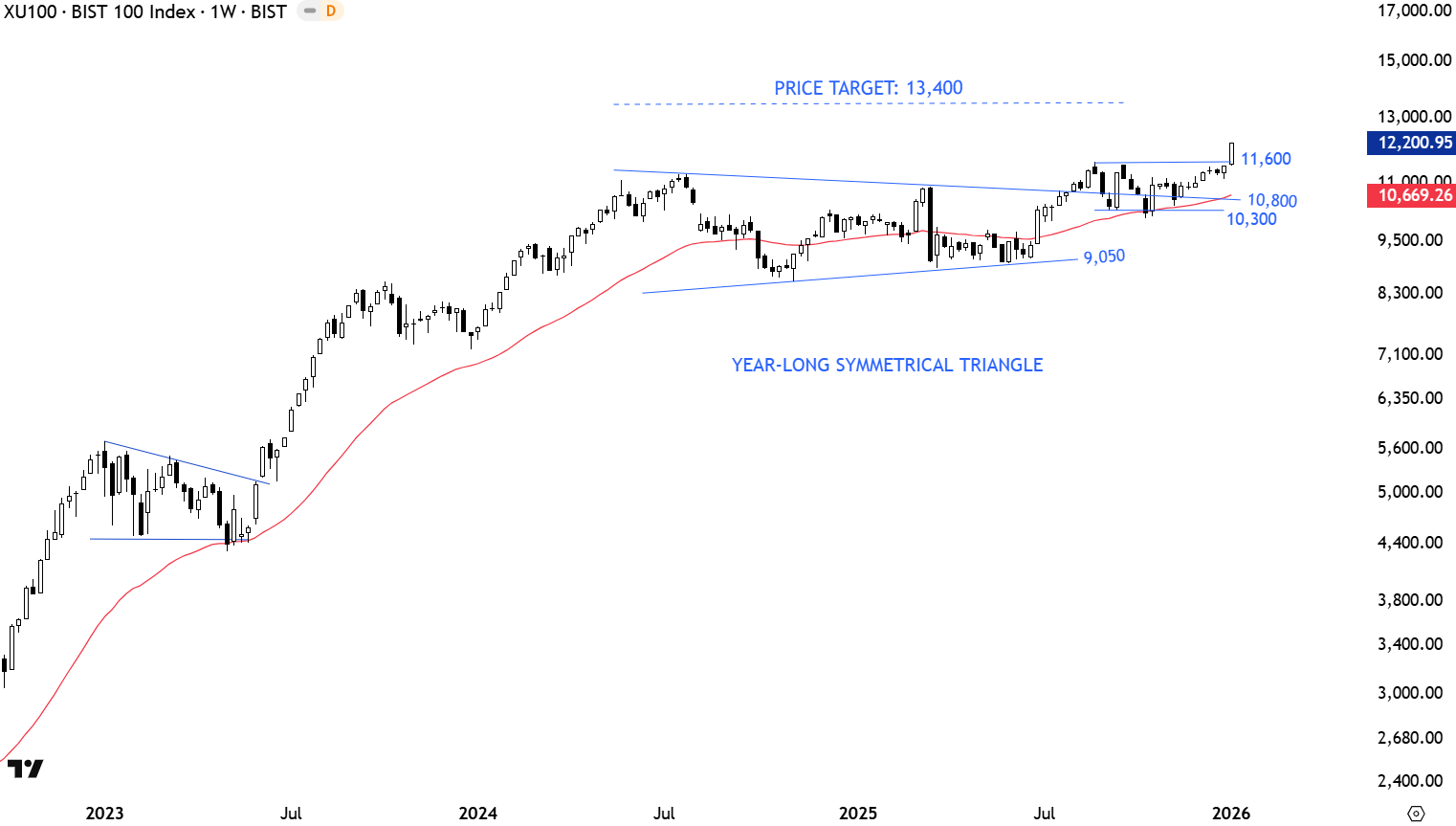 BIST 100 is possibly completing a long-term symmetrical triangle with the upper boundary at 10,800 and the lower boundary at 9,050 levels. A long-term bullish signal took place with the weekly candle that cleared the resistance at 10,800 levels. Possible symmetrical triangle price target stands at 13,400 levels. Breakout above 11,600 resistance confirmed the re-completion of the symmetrical triangle. 11,600 levels becomes the new support. Uptrend can accelerate.