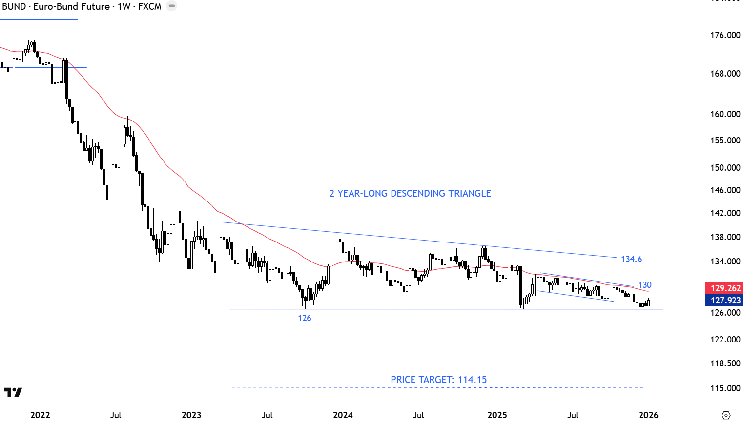 Bund is possibly forming a long-term descending triangle with the horizontal boundary acting as support at 126 levels. Consolidation below the long-term average might be forming a downward sloping channel with the upper boundary and the long-term average forming resistance at 130 levels. Breakout above 130 can push price higher towards the upper boundary of the descending triangle at 134.6 levels. Breakdown below 126 levels can set the price target as 114.15 levels. A breakdown confirmation requires a weekly close below 126 levels.