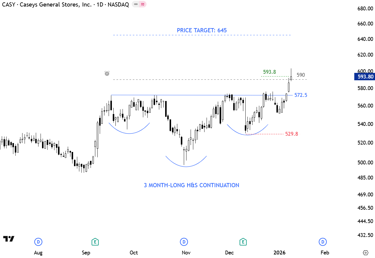 Casey’s General Stores, Inc. engages in the provision of management and operation of convenience stores and gasoline stations. It provides self-service gasoline, a wide selection of grocery items, and an array of freshly prepared food items. The stock is listed on the Nasdaq Stock Exchange. Price chart formed a 3 month-long H&S continuation with the horizontal neckline acting as resistance at 572.5 levels. The daily close above 590 levels confirmed the breakout with the price target of 645 levels. (Learn more: Video Tutorial)
