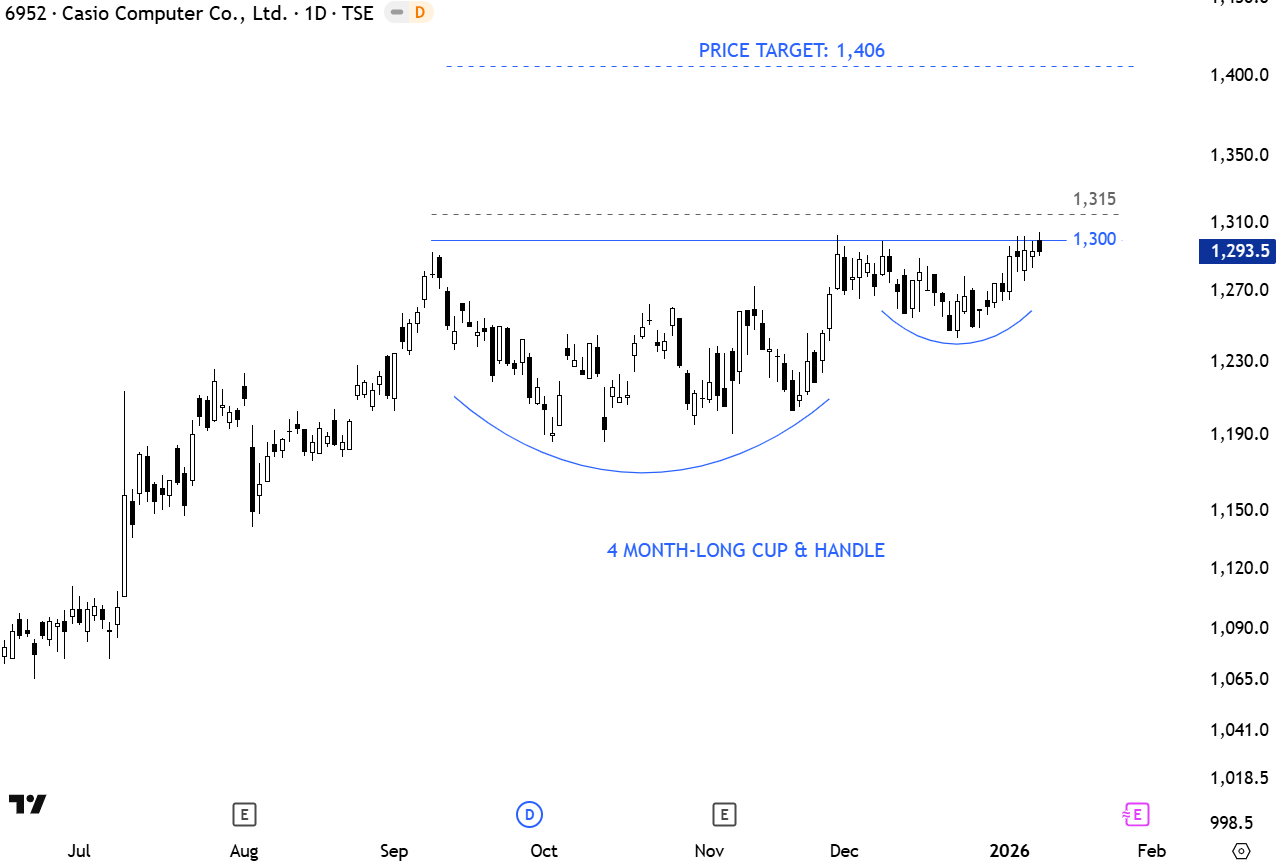 Casio Computer Co., Ltd. engages in the manufacture and sale of watches and personal electronic equipment. It operates through the following segments: Watches, Consumer, Systems, and Others. The stock is listed on the Tokyo Stock Exchange. Price chart formed a 4 month-long cup & handle continuation with the horizontal boundary acting as resistance at 1,296 levels. A daily close above 1,315 levels will confirm the breakout with the price target of 1,406 levels. (Learn more: Video Tutorial)