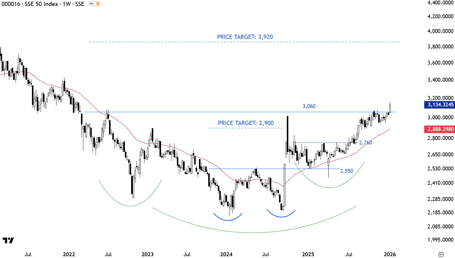 China SSE 50 Index has been in a steady downtrend over the past several years. The index completed a double bottom with the neckline at 2,550 levels. Double bottom price target was met at 2,900 levels. Previous resistance at 2,550 acted as the new support. Breakout above the horizontal resistance at 2,760 levels resulted in an upward price action. The index found resistance between 3,000-3,060 levels. A breakout above 3,060 levels took place with this week’s candle and it is very positive for the Asian benchmark and Emerging Market equities. Price target for the multi year-long base stands at 3,920 levels. 3,060 levels becomes the new support.