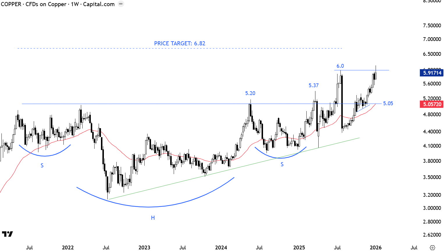 Copper experienced increased volatility around the pattern boundary at 5.05 levels. A possible long-term H&S continuation might be completing with the breakout above the neckline at 5.05 levels. The weekly close above 5.20-5.37 resistance area confirmed the long-term H&S continuation breakout. Price target for the multi year-long H&S continuation stands at 6.82 levels. Since July 2022, Copper price is forming higher lows that can be seen from the green upward sloping trend line. I view the latest strength as confirmation for the re-completion of the H&S pattern. For now price is finding resistance at 6.0 levels.