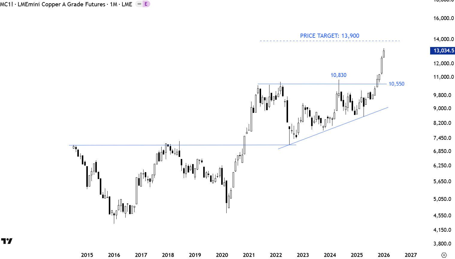 The LME Copper prices confirmed the breakout from the long-term ascending triangle with the strong monthly close. The upper boundary was acting as resistance at 10,550 levels. Breakout from the long-term bullish chart pattern is pushing prices higher towards the pattern objective at 13,900 levels. 10,550 level becomes the new support.