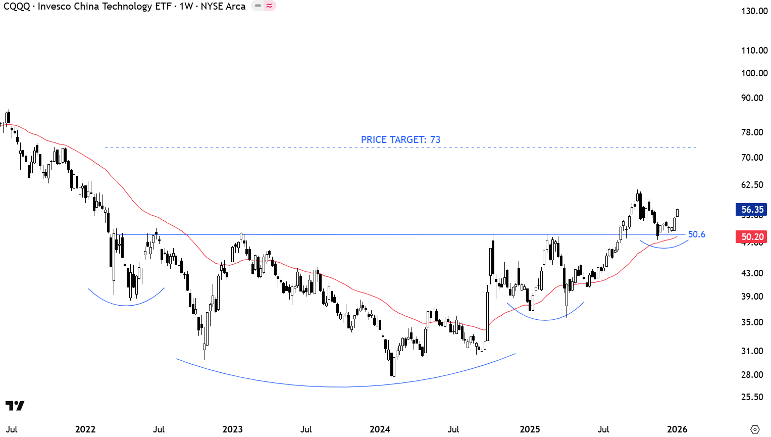 Invesco China Technology ETF is an exchange-traded fund that offers focused exposure to Chinese technology companies by tracking the FTSE China Incl A 25% Technology Capped Index. It holds predominantly Chinese tech and internet stocks like Tencent, PDD, Meituan and Baidu, with the top 10 typically making up over half of the fund. When compared with the bullish technical outlook on SSE50 Index discussed above, it has a similar technical outlook with its breakout from the massive base. CQQQ had an earlier breakout, followed by a pullback and now possibly getting ready for continuation higher. The horizontal boundary and the long-term average are forming support at 50.6 levels. Price target for the multi-month long base stands at 73 levels.