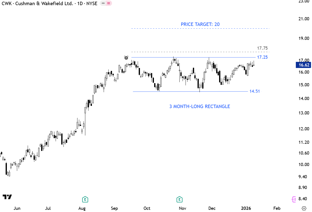 Cushman & Wakefield Ltd. s a global commercial real estate services firm for property owners. The company is headquartered in Hamilton, Bermuda. The stock is listed on the New York Stock Exchange. Price chart formed a 3 month-long rectangle with the upper boundary acting as resistance at 17.25 levels. A daily close above 17.75 levels will confirm the breakout with the price target of 20 levels. (Learn more: Video Tutorial)