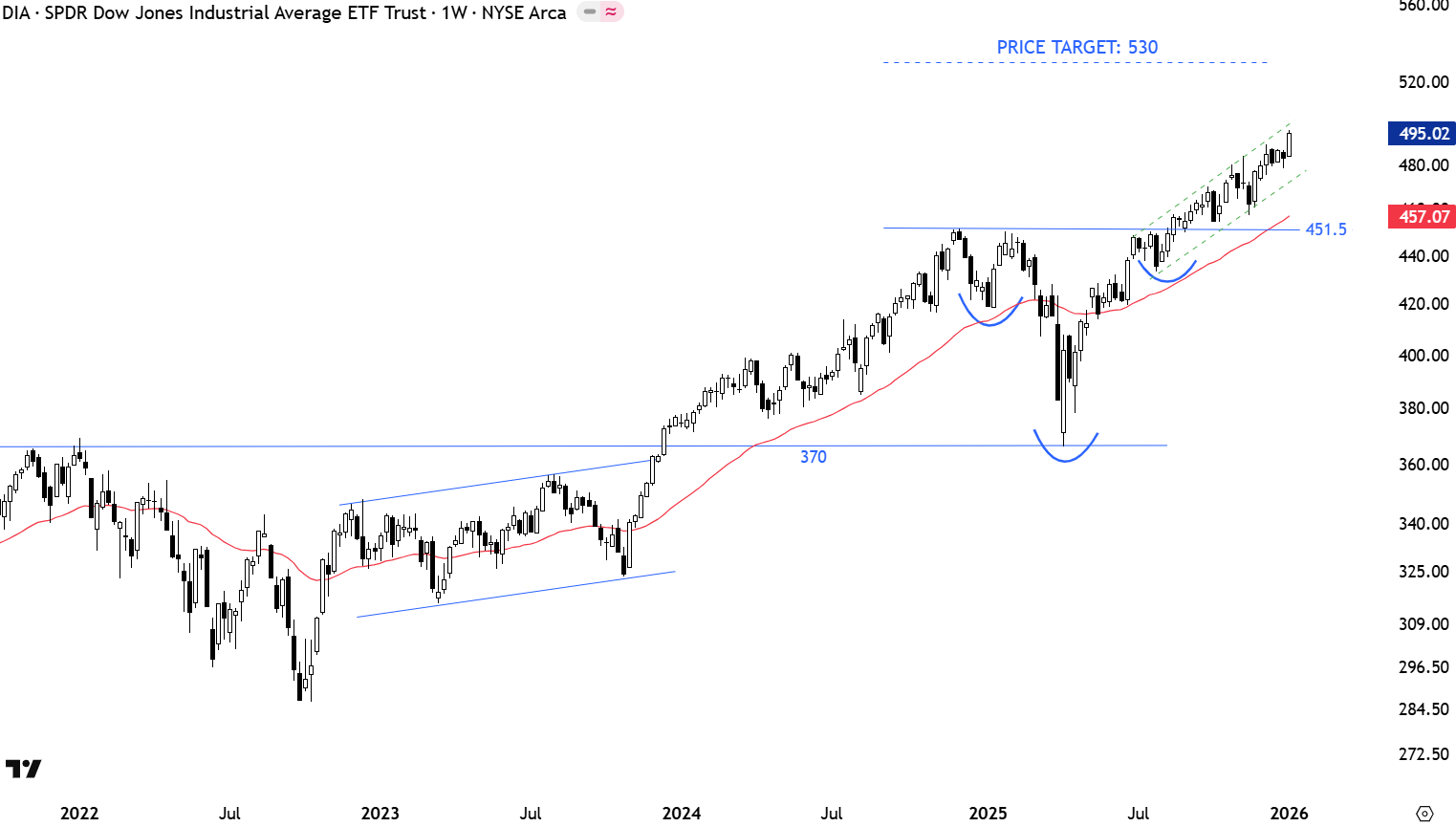 DIA rebounded from the strong support at 370 levels in the first half of the year. Recovery above the year-long average and continued strength targeted the next resistance at 451.5 levels. The ETF possibly completed a H&S continuation with the breach of the neckline at 451.5 levels. Outlook is positive with the price trending higher in a channel. 451.5 levels turns into support. Price target for the H&S continuation is at 530 levels.