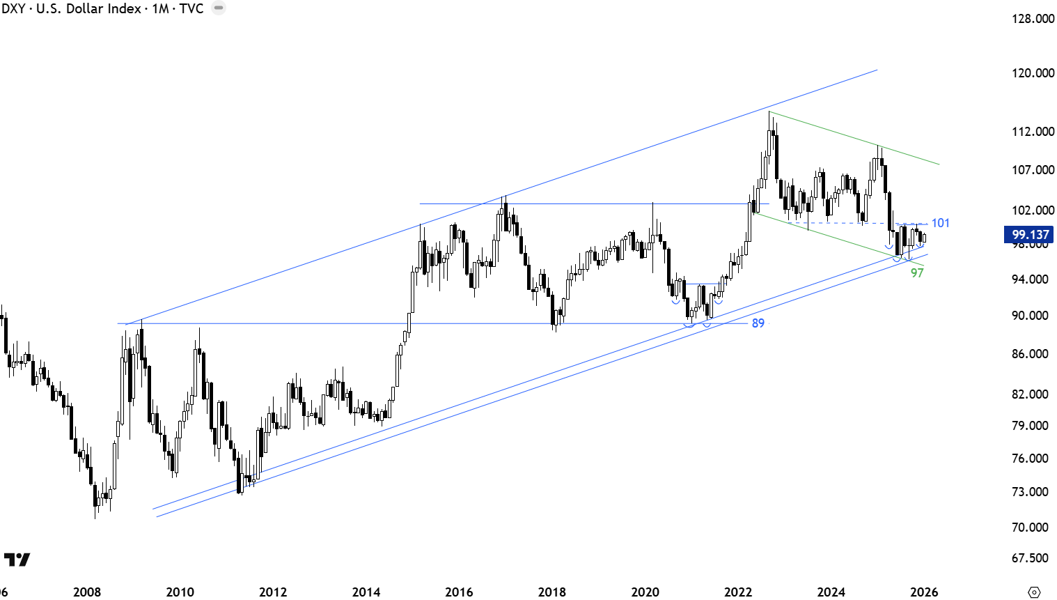 The USD Index better defined range is between 101 and 108.5 levels. The monthly close in May was below 101 levels. This increased the chances of a quick test of the lower boundary of the channel at 97 levels which took place with June and September weakness. A sharp recovery above 101 can renew the upward momentum for the U.S. Dollar Index. Long-term trend is upwards and remains inside the blue trend channel. We have seen a rebound from the lower boundary but not strong enough to result in a sharp reversal. Breakdown of the lower boundary of the trend channel can result in a long-term change of trend and target initially the horizontal support at 87 levels. Given that this is a monthly scale price chart, a breakdown needs a weak monthly close below 97 levels. A breakout above 101 levels on monthly scale can act as a bottom reversal signal similar to 2014 and 2021 reversals from the lower boundary of channel.