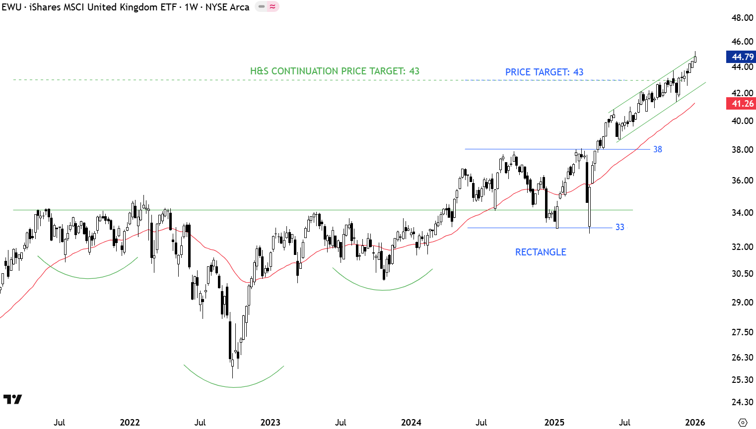 The correction towards 34.5 levels in the beginning of the year was a hard re-test for the 3 year-long H&S continuation. With April’s sharp correction price once again tested and rebounded from the strong horizontal support. The ETF completed a sideways consolidation between 33 and 38 levels. Price target for the rectangle was met at 43 levels. Uptrend is intact. Long-term average at 41.26 can act as long-term support. Uptrend is possibly moving in a trend channel (labelled with green boundaries)