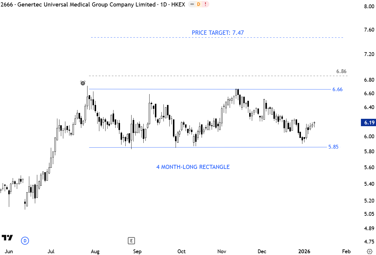 Genertec Universal Medical Group Co., Ltd. engages in the provision of healthcare services. Its services include advisory services, sale of medical equipment, and medical equipment leases. The stock is listed on the Hong Kong Stock Exchange. Price chart formed a 4 month-long rectangle with the horizontal boundary acting as resistance at 6.66 levels. A daily close above 6.86 will confirm the breakout with the price target of 7.47 levels. (Learn more: Video Tutorial)