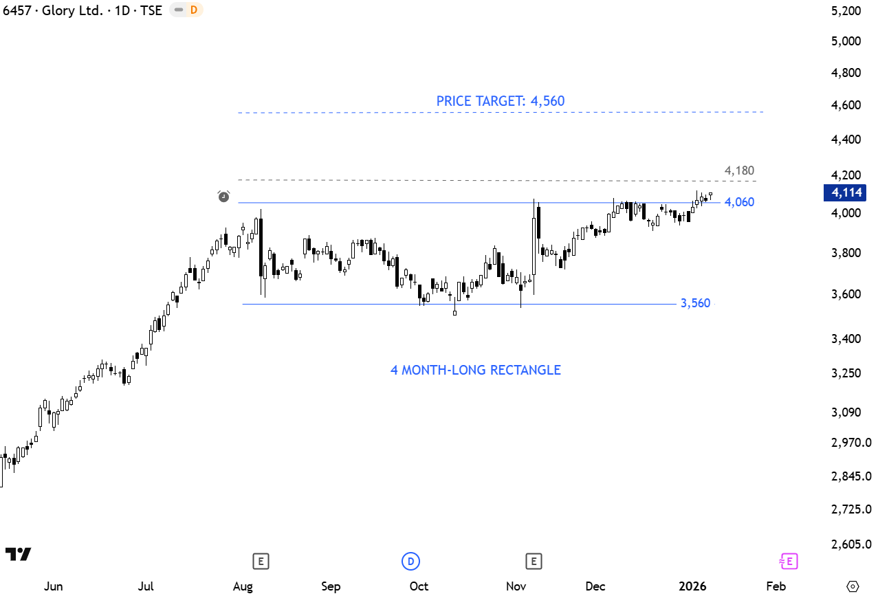 Glory Ltd. engages in the development, manufacture, and sale of cash handling machines and systems. Its operations are carried out through the following segments: Financial Market, Retail and Transportation Market, Amusement and Gaming Market, Overseas Market, and Others. The stock is listed on the Tokyo Stock Exchange. Price chart formed a 4 month-long rectangle with the upper boundary acting as resistance at 4,060 levels. A daily close above 4,180 levels will confirm the breakout with the price target of 4,560 levels. (Learn more: Video Tutorial)
