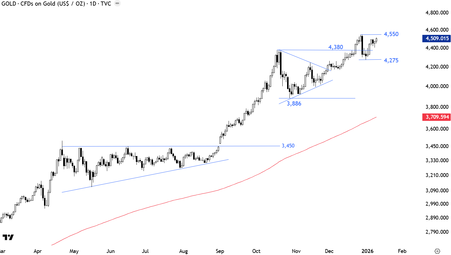 Silver’s long-term horizontal resistance stands at 50 levels. Given that $50 is a multi-decade long resistance and a breakout means completion of that range. The strong monthly close (which took place in November) is a long-term breakout confirmation. The most recent short-term consolidation was analyzed as an ascending triangle with the upper boundary at 54.5 levels. Price target for the short-term bullish continuation chart pattern was met at 63.4 levels. 54.5-50 area turns into support. Silver’s uptrend is becoming steep and price can be exposed to a pause or a quick pullback. I have discussed the application of ATR based tailing stop-losses in such uninterrupted rallies in order to protect any open profit during a sharp pullback. (Link for the post and the open source code for the ATR trailing stop) (X Posts on ATR Trailing Stop) A short-term consolidation might be forming between 70 and 83.75 levels. Tight consolidation can act as a bullish continuation and resume the uptrend.