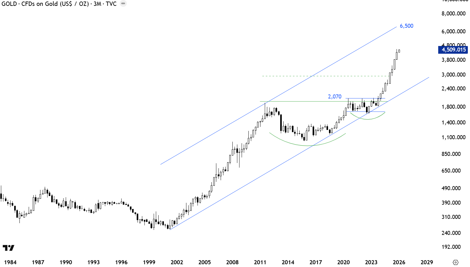 Breakout above 2,070 levels completed a multi-year long rectangle with the price target of 2,460 levels. The breakout from the rectangle also completed a multi-year long cup & handle continuation with the price target of 3,000 levels. Gold price reached and exceeded all chart pattern price objectives and the price chart is showing a steep advance. A long-term trend channel can be drawn with the upper boundary forming resistance at 6,500 levels. If Gold is in an uptrend similar to 2000-2012 period, the angle of the uptrend can target the upper boundary in the following months/years. The lower boundary of the trend channel and the horizontal support will act as long-term support area between 2,070 and 2,400 levels. (This analysis is for long-term asset allocators. The chart is on quarterly scale)