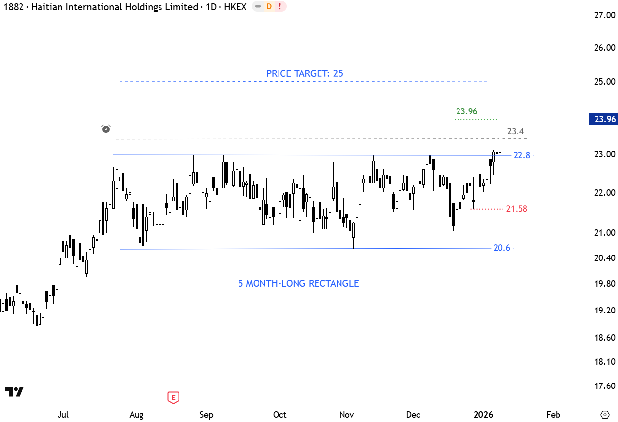 Haitian International Holdings Ltd. is an investment company, which engages in the development and production of plastic injection molding machines. The stock is listed on the Hong Kong Stock Exchange. Price chart formed a 4 month-long rectangle with the upper boundary acting as resistance at 22.8 levels. The daily close above 23.4 levels confirmed the breakout with the possible chart pattern price target of 25 levels. (Learn more: Video Tutorial)