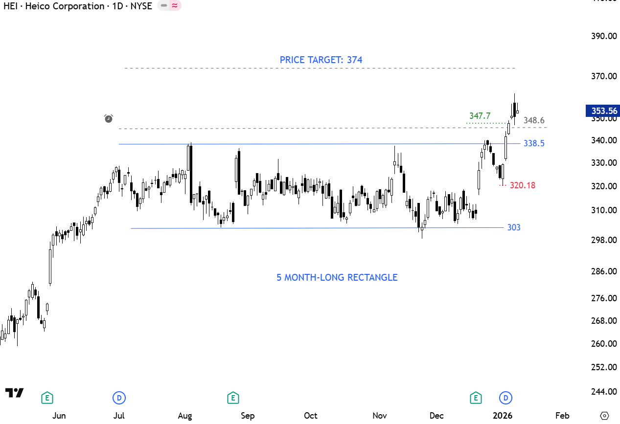 HEICO Corp. engages in the manufacturing of electronic equipment for the aviation, defense, space, medical, telecommunications, and electronics industries. The stock is listed on the New York Stock Exchange. Price chart formed a 5 month-long rectangle with the horizontal boundary acting as resistance at 338.5 levels. The daily close above 348.6 levels confirmed the breakout with the possible price target of 374 levels. (Learn more: Video Tutorial)