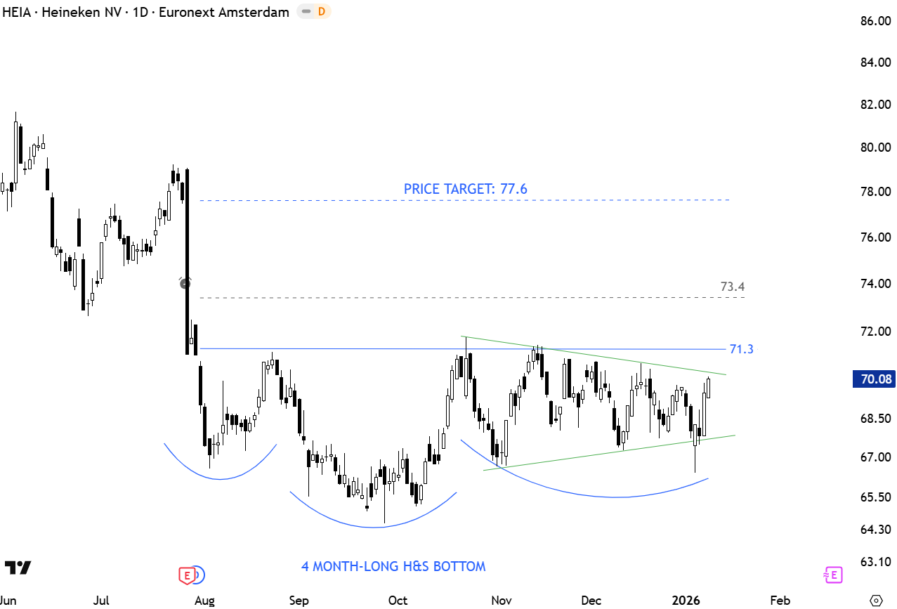 Heineken NV engages in the manufacture and distribution of alcoholic and non-alcoholic beverages. It offers products under the Heineken, Amstel, Desperados, Sol, Tiger, Birra Moretti, Affligem, Lagunitas, Mort Subite, Strongbow Apple Ciders, Orchard Thieves, Stassen, Bulmers, Old Mout, and Blind Pig brands. The stock is listed on the Amsterdam Stock Exchange. Price chart formed a 4 month-long H&S bottom reversal with the horizontal neckline acting as resistance at 71.3 levels. A daily close above 73.4 levels will confirm the breakout with the possible price target of 77.6 levels. (Learn more: Video Tutorial)