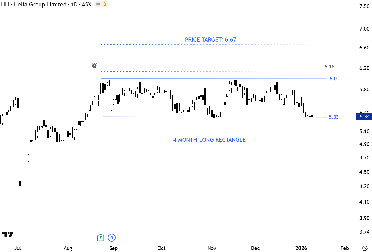 Helia Group Ltd. engages in the provision of lenders mortgage insurance. It is also involved in the residential mortgage policy development with the lending institutions, local and international regulators and government and industry bodies. The stock is listed on the Sydney Stock Exchange. Price chart formed a 4 month-long rectangle with the upper boundary acting as resistance at 6.0 levels. A daily close above 6.18 will confirm the breakout with the possible price target of 6.67 levels. (Learn more: Video Tutorial)