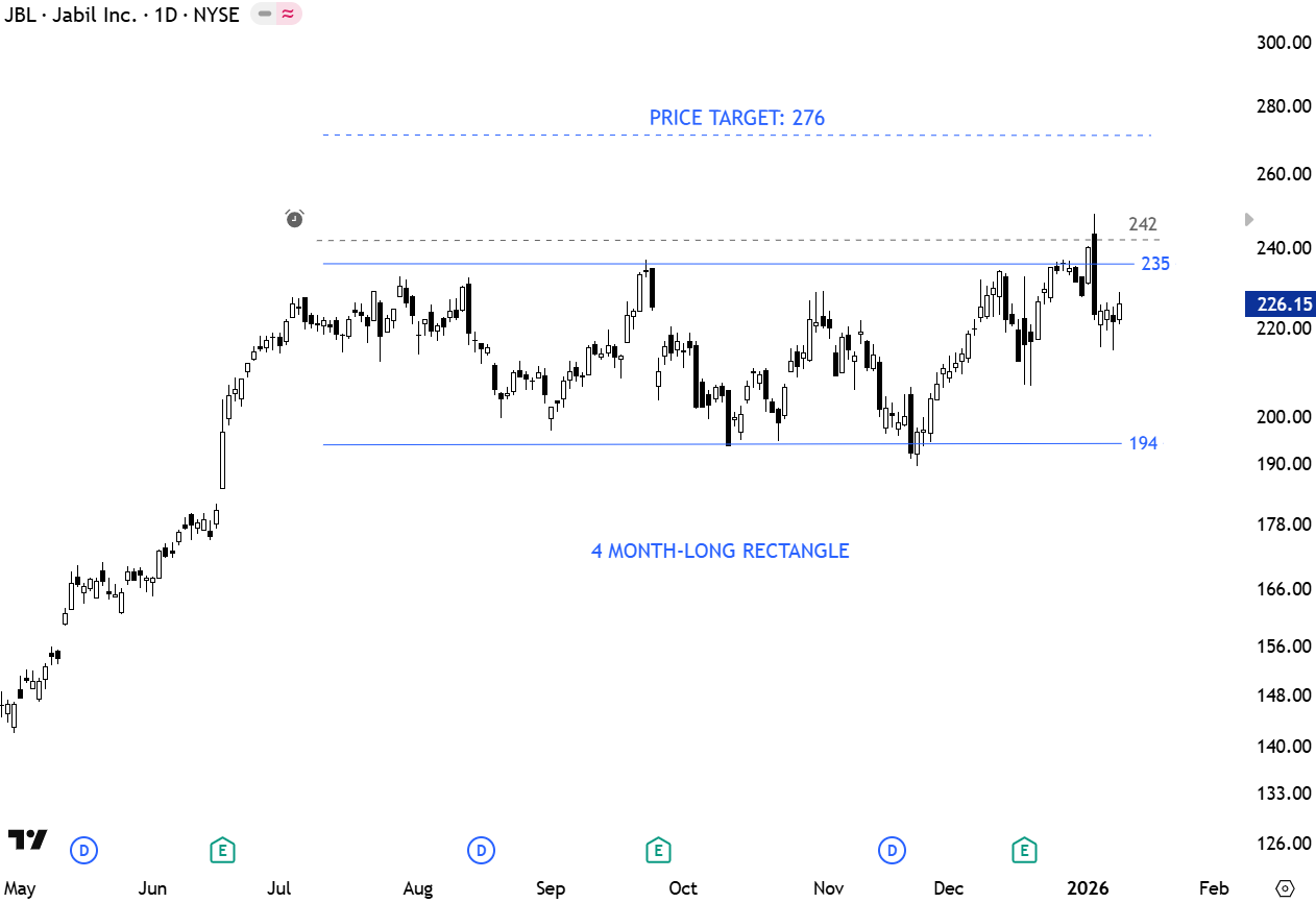 Jabil, Inc. engages in the provision of manufacturing services and solutions. It operates through the Electronics Manufacturing Services (EMS) and Diversified Manufacturing Services (DMS) segments. The stock is listed on the NYSE. Price chart formed a 4 month-long rectangle with the upper boundary acting as resistance at 235 levels. A daily close above 242 levels will confirm the breakout with the price target of 276 levels. (Learn more: Video Tutorial)