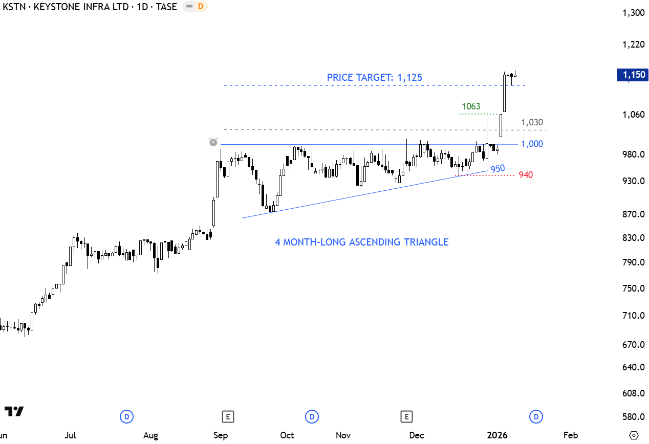 Keystone Infra Ltd. operates as an infrastructure investment fund. It invests in infrastructure assets in the energy, renewable energy, transportation, water desalination, and communication sectors. The stock is listed on the Tel Aviv Stock Exchange. Price chart formed a 4 month-long ascending triangle with the upper boundary acting as resistance at 1,000 levels. The daily close above 1,030 levels confirmed the breakout with the price target of 1,125 levels. (Learn more: Video Tutorial)