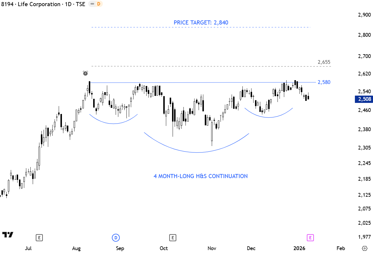 Life Corp. owns and operates supermarkets that retail food products and clothing. The stock is listed on the Nikkei Stock Exchange. Price chart formed a 4 month-long H&S continuation with the horizontal neckline acting as resistance at 2,580 levels. A daily close above 2,655 levels will confirm the breakout with the possible chart pattern price target of 2,840. (Learn more: Video Tutorial)