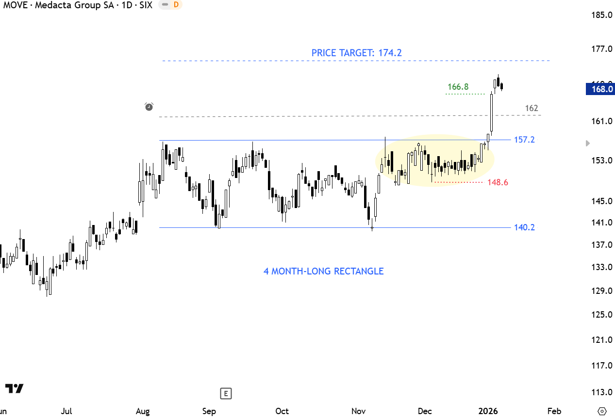 Medacta Group SA engages in the design, production, and distribution of innovative, personalized, and sustainable solutions for joint replacement, sports medicine, and spine surgery. The stock is listed on the Swiss Stock Exchange. Price chart formed a 3 month-long rectangle with the upper boundary acting as resistance at 157.2 levels. The daily close above 162 levels confirmed the breakout with the possible chart pattern price target of 174.2 levels. (Learn more: Video Tutorial)