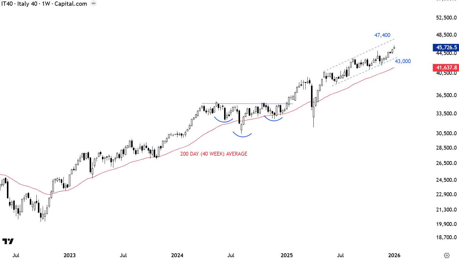 One of the better looking European equity benchmark after Germany’s DAX index is Italy’s FTSE MIBTEL. The benchmark completed an 8 month-long H&S continuation chart pattern with the neckline at 35,150 levels. The 200-day (40 week) average has been an important support since the beginning of 2023. Uptrend is intact. The lower boundary of the channel is acting as support at 43,000 and the next support is the 200-day average at 41,637. Uptrend can accelerate in the trend channel towards the upper boundary at 47,400 levels.
