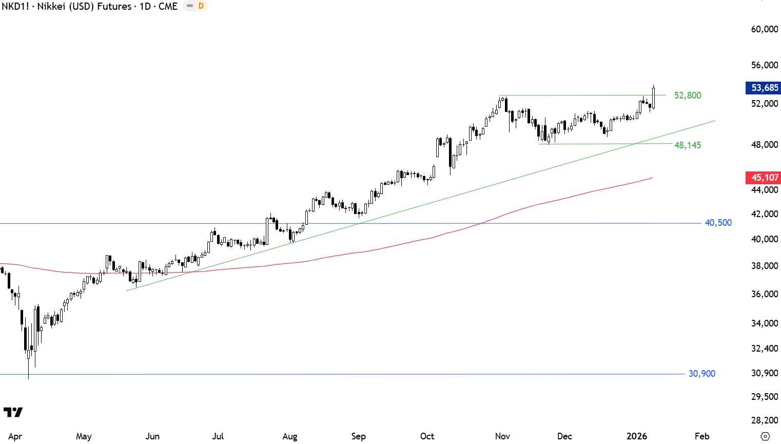 Japan’s NIKKEI 225 breakout from the tight consolidation during June-July period is resuming the uptrend. The index continues to form higher lows. Breakout above the resistance at 52,800 can add momentum to the uptrend. Support area is between 48,145 and 52,800.