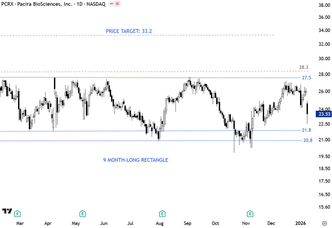 Pacira BioSciences, Inc. is the holding company for its subsidiary, Pacira Pharmaceuticals, Inc. The stock is listed on the Nasdaq Stock Exchange. Price chart formed a 7 month-long rectangle with the horizontal boundary acting as strong resistance at 27.50 levels. The lower boundary is acting as support at 21.8 levels. Both boundaries were tested several times over the course of the chart pattern. A daily close above 28.30 levels will confirm the breakout from the 7 month-long rectangle with the possible chart pattern price target of 33.20 levels. (Learn more: Video Tutorial)