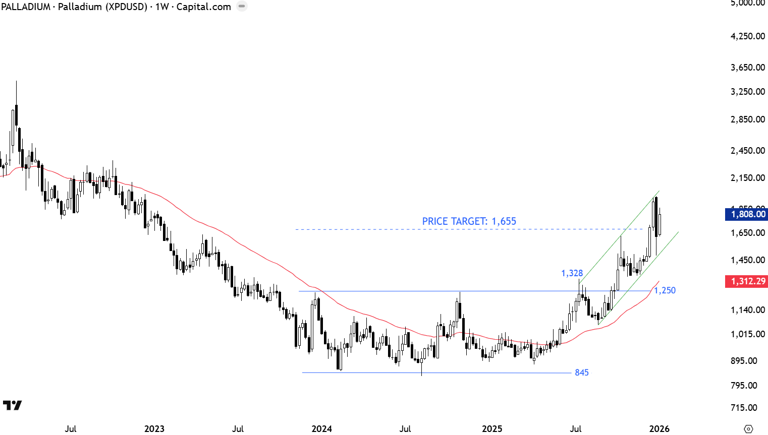 Similar to Copper and Aluminum, Palladium price chart completed its long-term breakout. This is another industrial metal that has been building up energy in a multi-year long sideways consolidation. The weekly scale chart below experienced a strong weekly candle that cleared 1250-1328 area. Completion of the rectangle as a bottom reversal offered an upside potential towards 1,655 levels. 1,250-1,328 area becomes the new support. Price target is met. There is no top reversal chart pattern at this stage. Uptrend can resume.
