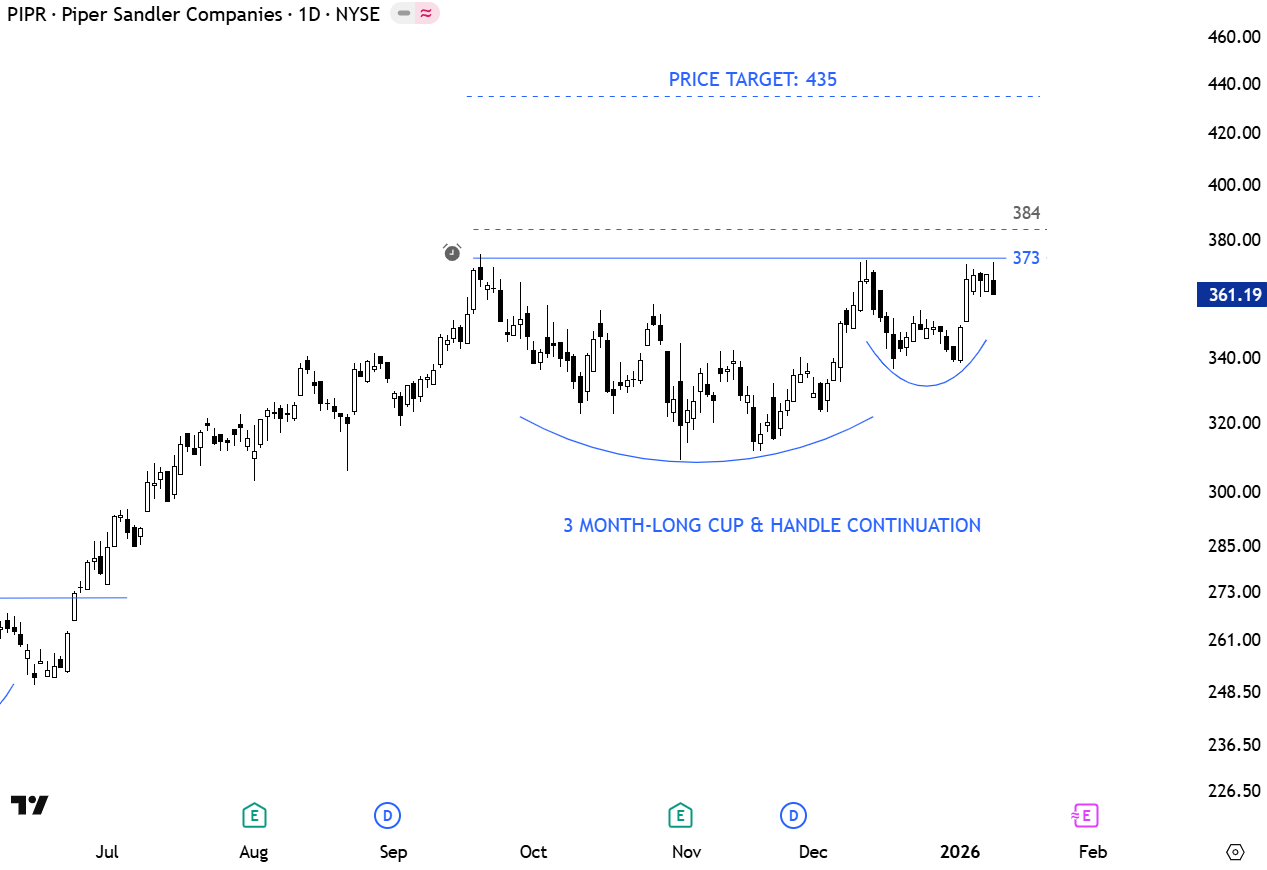 Piper Sandler Cos. engages in the provision of investment banking and institutional securities services. It offers financial advisory services, equity and debt capital markets products, public finance services, equity research and institutional brokerage, fixed income services, and private equity strategies. The stock is listed on the New York Stock Exchange. Price chart formed a 3 month-long cup & handle continuation with the horizontal boundary acting as resistance at 373 levels. A daily close above 384 levels will confirm the breakout with the price target of 435 levels. (Learn more: Video Tutorial)