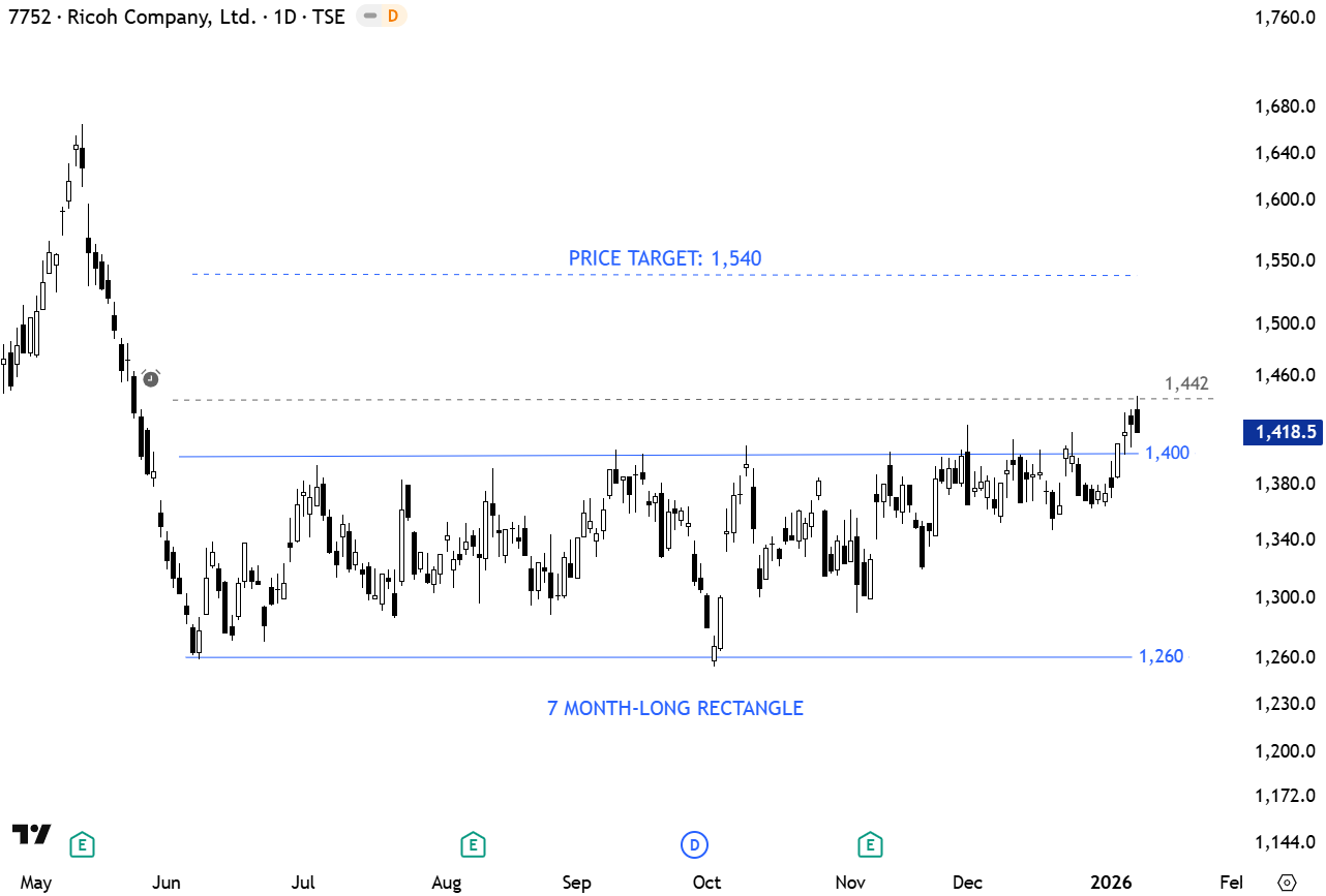 Ricoh Co., Ltd. engages in the development, production, sale, and provision of services for imaging systems, industrial printers, and network equipment. It operates through the following segments: Office Printing, Office Services, Commercial Printing, Industrial Printing, Thermal, and Others. The stock is listed on the Tokyo Stock Exchange. Price chart formed a 5 month-long rectangle with several times tested boundaries. The pattern can act as a bottom reversal. A daily close above 1,442 levels will confirm the bottom reversal with the price target of 1,540 levels. (Learn more: Video Tutorial)