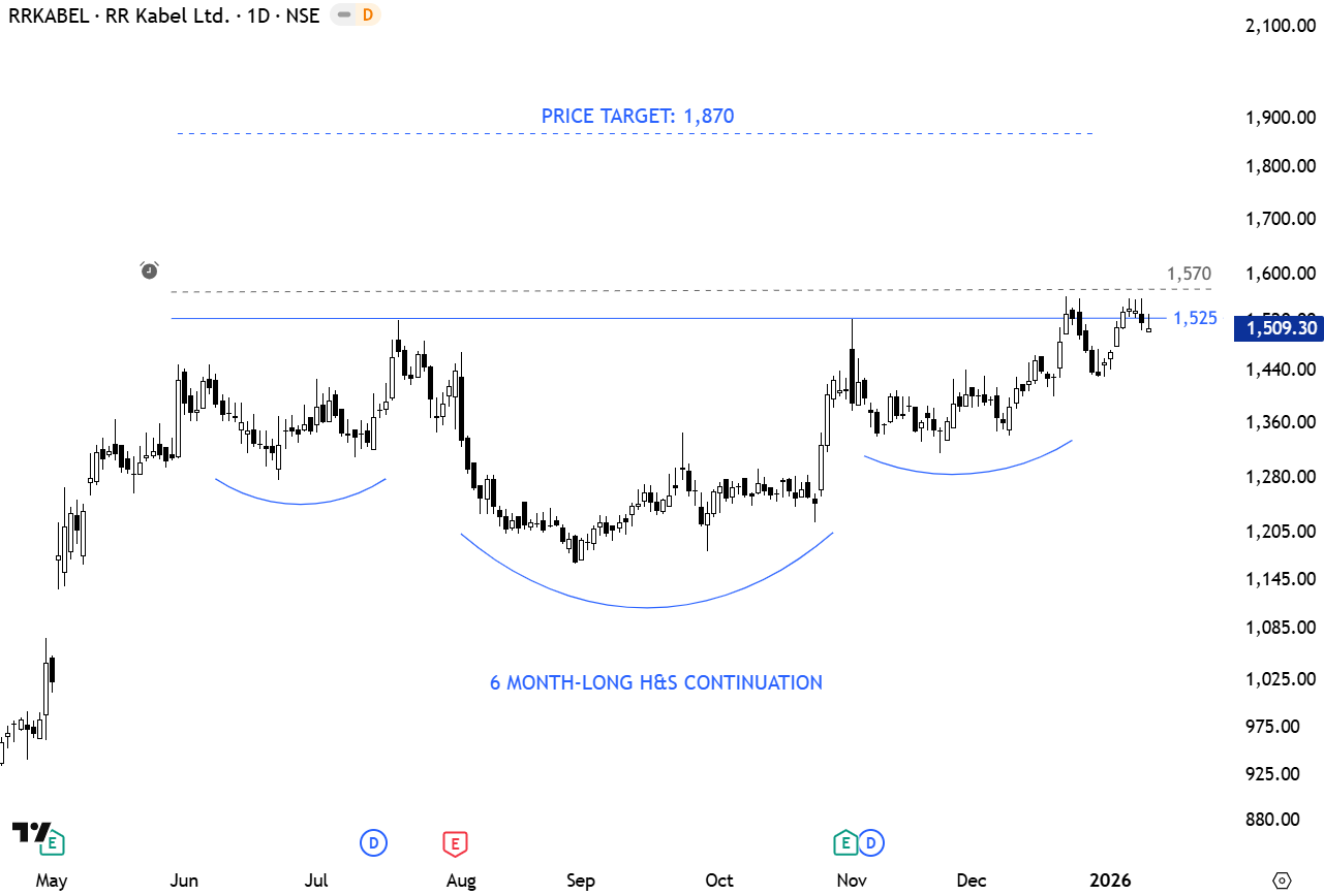 RR Kabel Ltd. is an electrical manufacturing company engaged in the provision of wire, cable, and fast moving electrical goods. The stock is listed on the National Stock Exchange of India. Price chart formed a 6 month-long H&S continuation with the horizontal boundary acting as resistance at 1,525 levels. A daily close above 1,570 will confirm the breakout from the bullish continuation chart pattern with the price target of 1,870 levels. (Learn more: Video Tutorial)