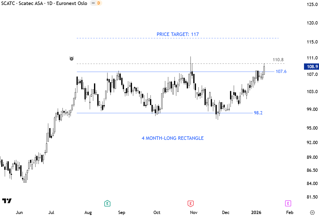 Scatec ASA engages in the production, delivery, and deployment of solar power. It operates through the following business segments: Power Production; Operation and Maintenance; Development and Construction; and Corporate. The stock is listed on the Euronext Oslo. Price chart possibly formed a 3 month-long rectangle with the upper boundary acting as resistance at 107.6. A daily close above 110.8 levels will confirm the breakout with the possible price target of 117 levels. (Learn more: Video Tutorial)