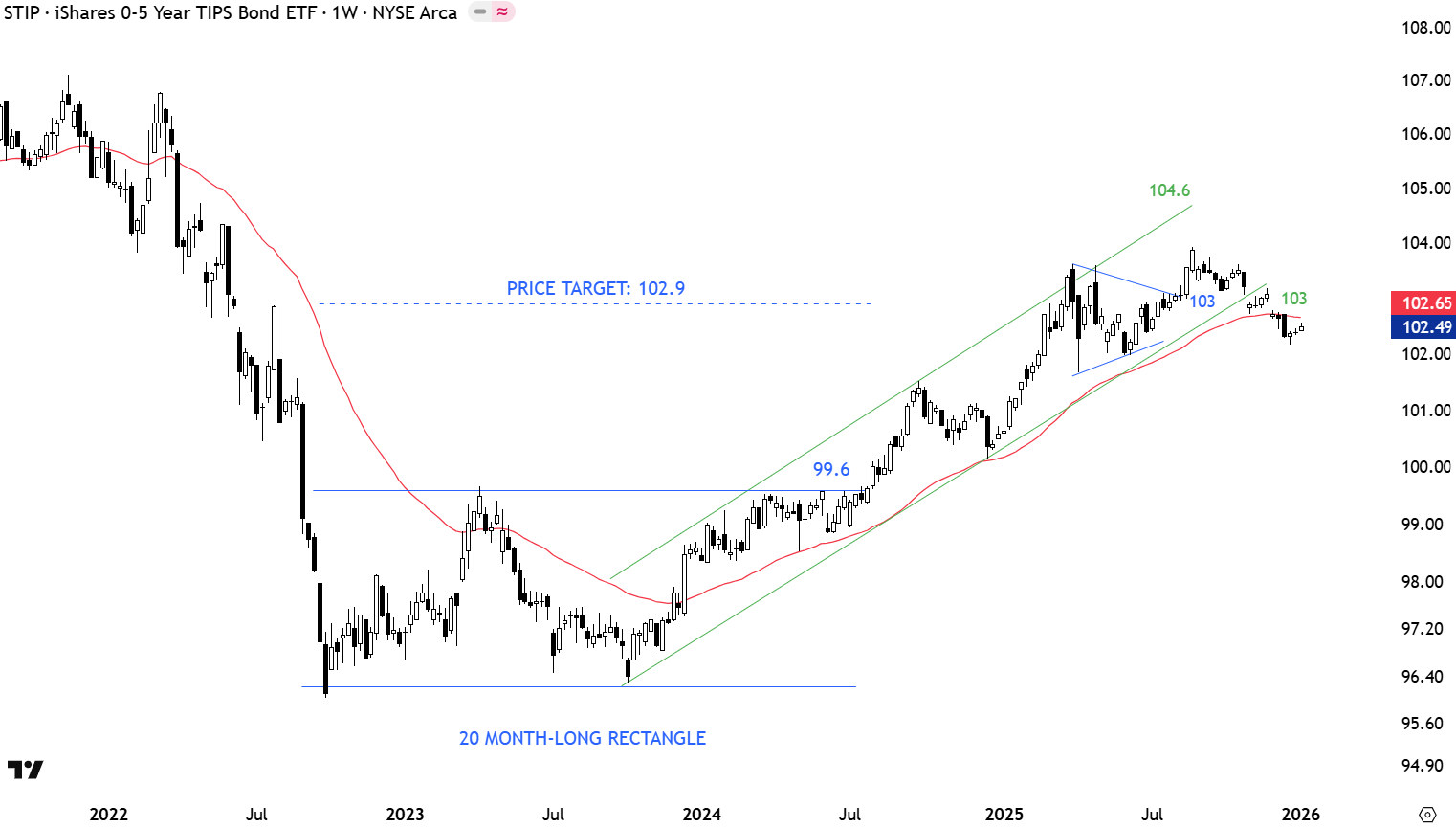 The I-SHARE 0-5 YR TIPS BOND ETF seeks to track the investment results of an index composed of inflation-protected U.S. Treasury bonds with remaining maturities of less than five years. It seeks to protect against near-term inflation. Price chart completed a 20 month-long rectangle with the upper boundary acting as resistance at 99.6 levels. Q2 2024 consolidation right below the resistance was a preparation for a breakout higher. Breakout in August 2024 confirmed the rectangle as bottom reversal with the price target of 102.9 levels. Price target was met. Breakdown below the 200-day average is changing the outlook to negative and suggests lower prices on TIPS Bond ETF. The 200-day average at 102.65 and the channel boundary at 103 become the resistance area. Weakness can target 99.6-100 support area.