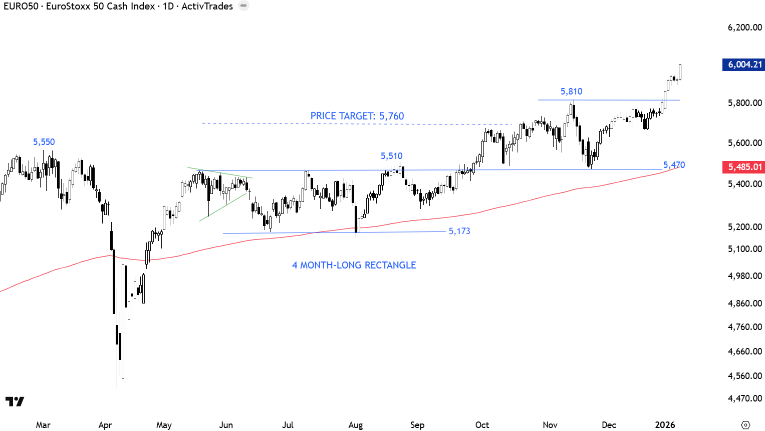 EuroStoxx 50 index breakout above 5,470 levels confirmed the rectangle as a bullish continuation with the price target of 5,760 levels. 5,470-5,510 area acted as strong support. The index rebounded from the horizontal support at 5,470 levels. Breakout above 5,810 levels is now resuming the uptrend. 5,810 level turns into short-term support.