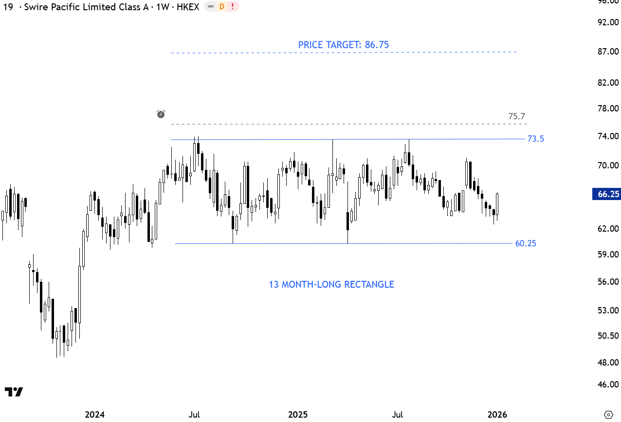 Swire Pacific (HKEX: 19) is a conglomerate engaged in property, aviation, beverages, and trading across Asia. The stock has formed a 13-month-long rectangle pattern that can act as a continuation chart pattern. The horizontal upper boundary acts as a resistance around 73.5 levels, with support near 60.25. A daily close above 75.7 will confirm the breakout, potentially triggering a move toward the price target of 86.75. (Learn more: Video Tutorial)
