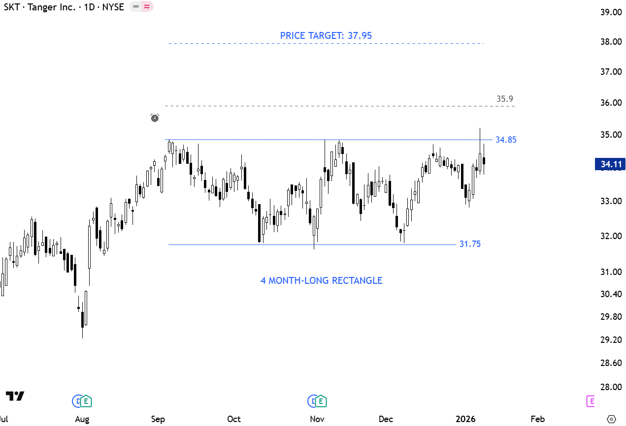 Tanger, Inc. engages in the operation of upscale open-air outlet centers. The firm focuses on developing, acquiring, owning, operating, and managing outlet shopping centers. The stock is listed on the New York Stock Exchange. Price chart formed a 4 month-long rectangle with the horizontal upper boundary acting as resistance at 34.85 levels. A daily close above 35.9 levels will confirm the breakout with the price target of 37.95 levels. (Learn more: Video Tutorial)