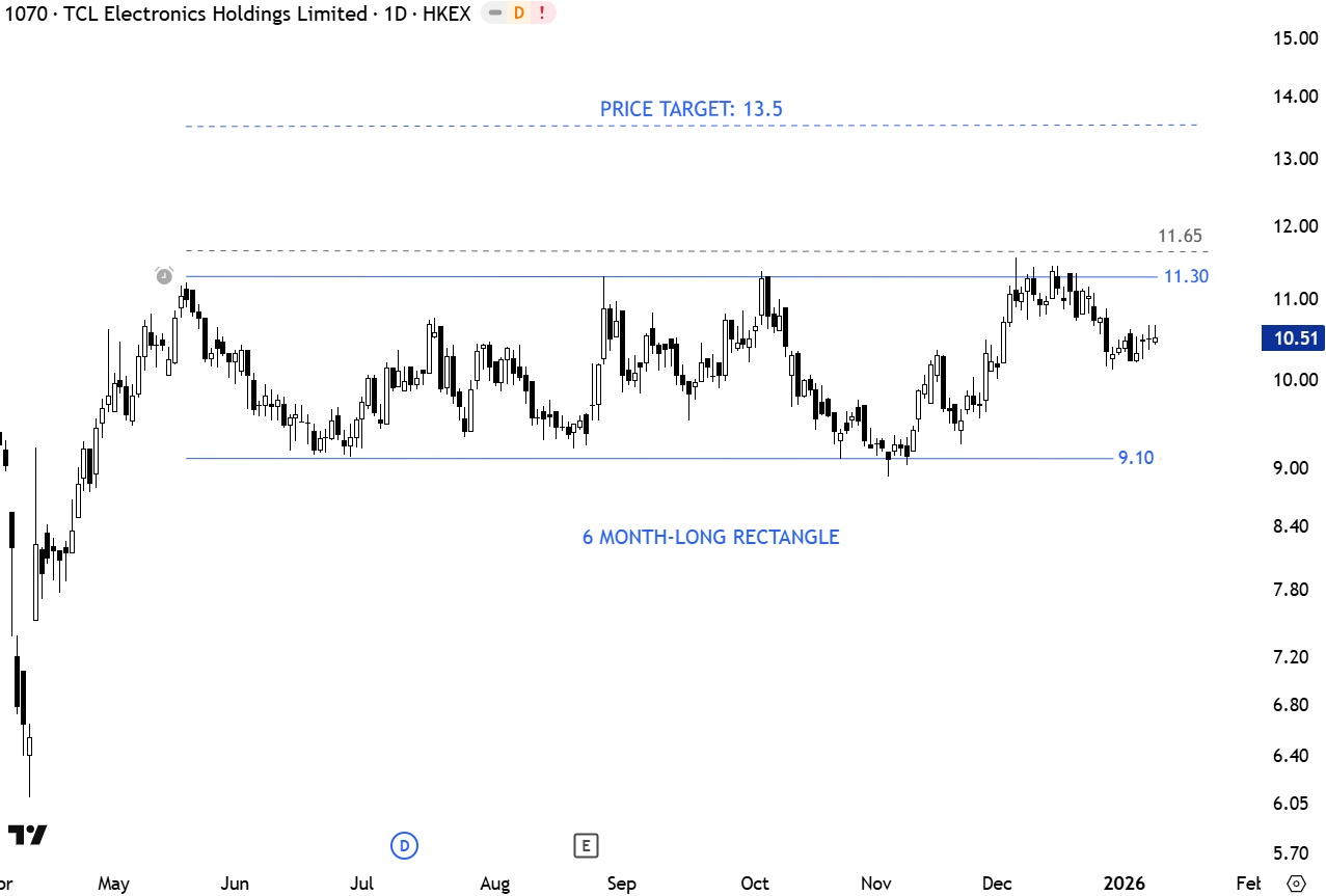 TCL Electronics Holdings Ltd. operates as a holding company with interest in manufacturing of multimedia electronics. The company operates through the following business segments: Smart Screen Segment; Internet Business Segment; Smart, Mobile, Connective Devices, and Services Segment; and Smart Commercial Display. The stock is listed on the Hong Kong Stock Exchange. Price chart formed a 5 month-long rectangle withe the several times tested horizontal boundary acting as resistance at 11.30 levels. A daily close above 11.65 levels will confirm the breakout with the possible chart pattern price target of 13.5 levels. (Learn more: Video Tutorial)