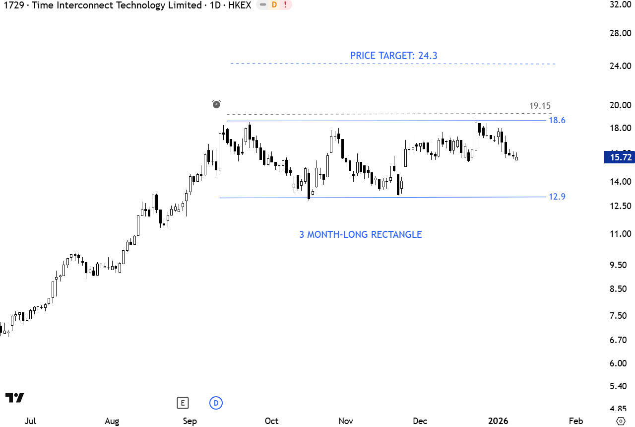 Time Interconnect Technology Ltd. is an investment holding company, which through its subsidiaries, engages in the manufacture and sale of cable assembly products. The stock is listed on the Hong Kong Stock Exchange. Price chart formed a 3 month-long rectangle with the upper boundary acting as resistance at 18.6 levels. A daily close above 19.15 levels will confirm the breakout with the price target of 24.3 levels. (Learn more: Video Tutorial)