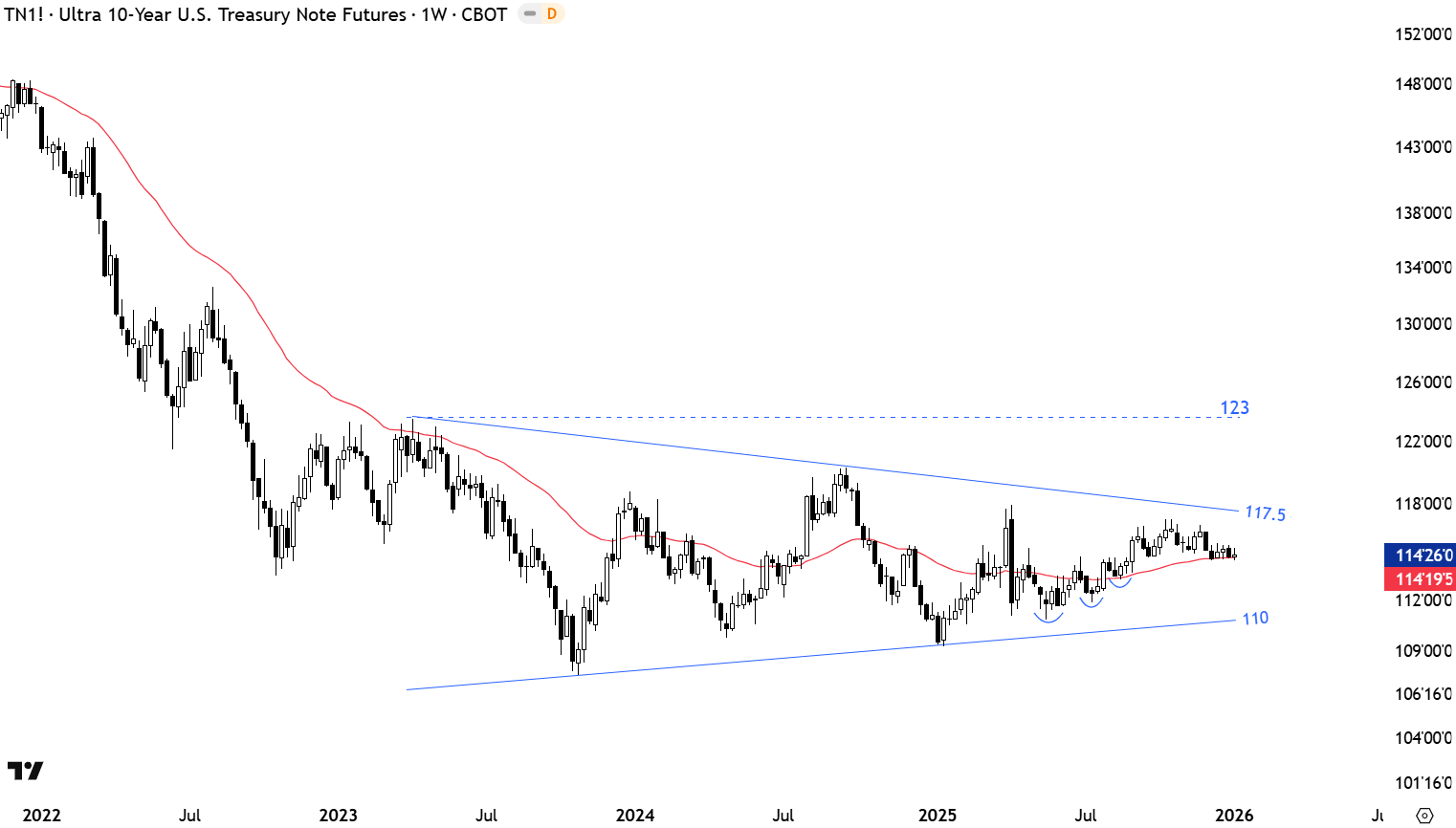 The U.S. 10 Year T-Note might be forming a long-term symmetrical triangle with the lower boundary acting as support at 110 and the upper boundary as resistance at 117.5 levels. Price can remain volatile in this range in the following weeks. Breakout above 117.5 levels can resume the uptrend towards the next resistance at 123 levels. Breakdown below the long-term average can result in a weakness towards the lower boundary at 110.