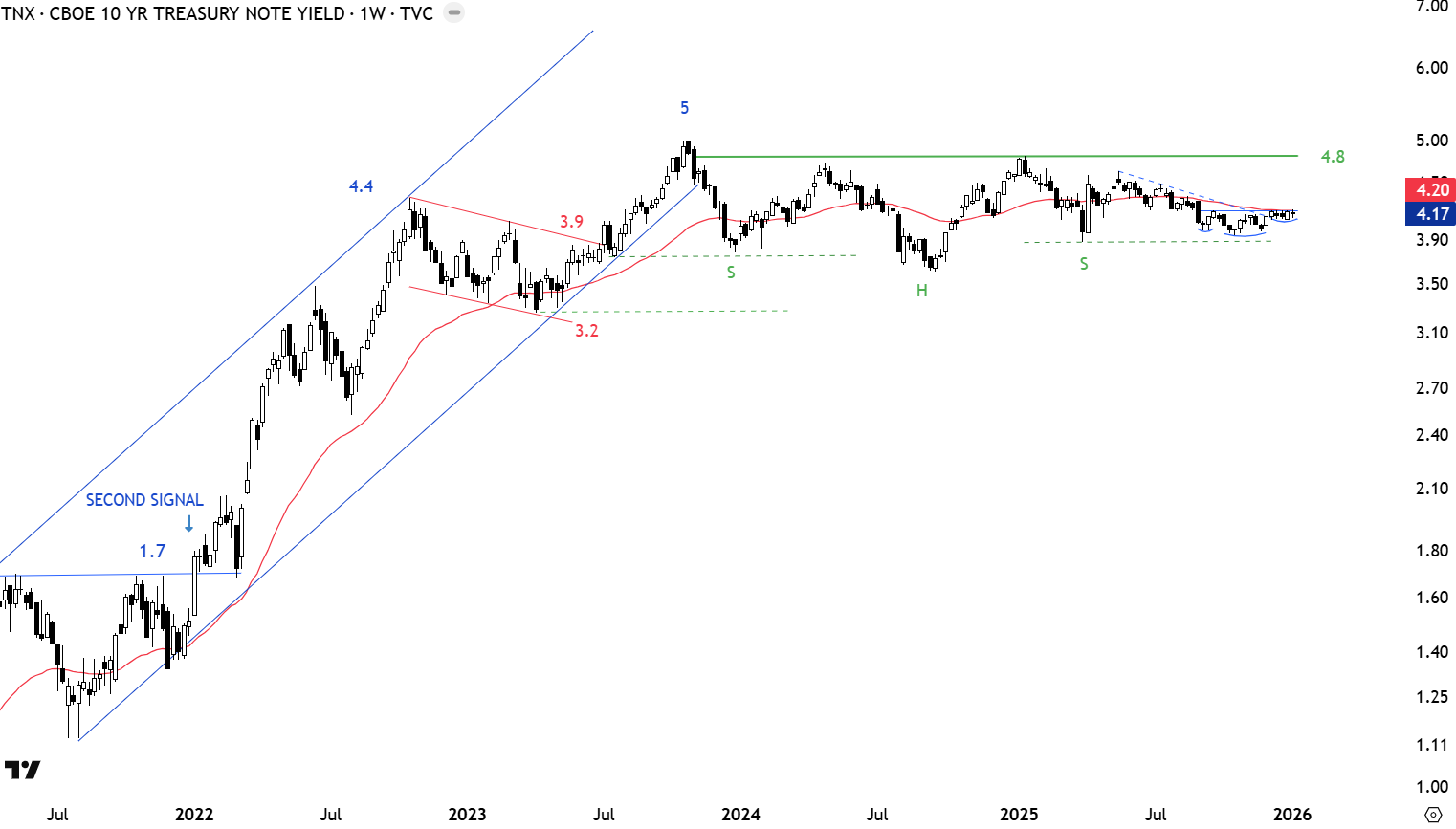 4.8-5.0 area is the strong resistance formed by the horizontal neckline and the high at 5.0 levels. Wide trading range is between 3.5 and 5.0 levels. A possible H&S continuation might be forming with the neckline at 4.8 levels. Breakout above 4.8 can resume the uptrend on 10 year yields. Yields remain elevated and suggest inflation is still a concern. The H&S continuation can fail in the case of a breakdown below the low of the right shoulder at 3.9 levels.