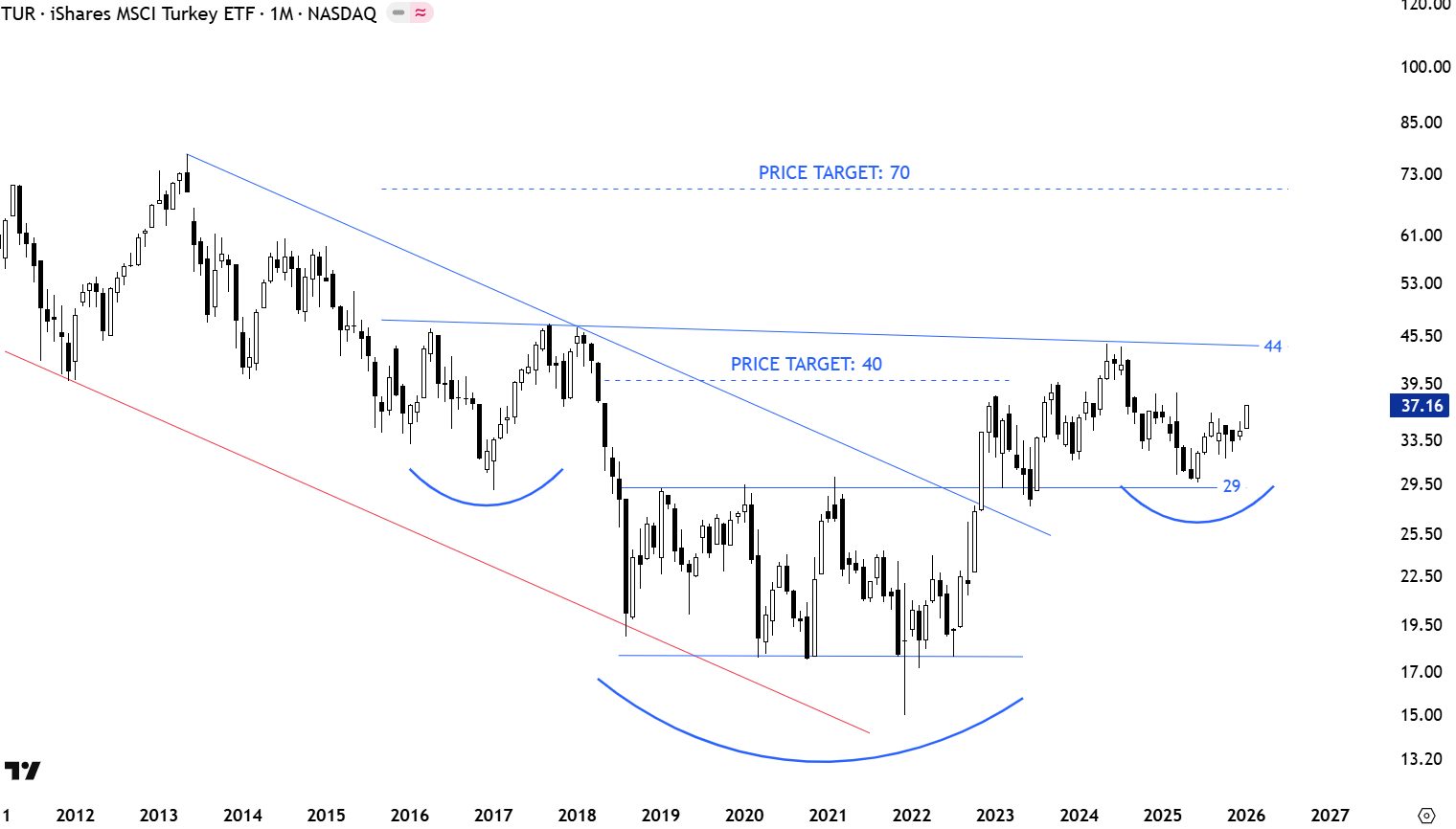 The Ishares MSCI Turkey ETF can be a good proxy to take advantage of possible strength in Turkish equities. The ETF found support above 29 levels. A rally towards 44 can better define the right shoulder of a massive bottom reversal. Only after a breakout above 44 we will confirm the bottom reversal with the price target of 70 levels.