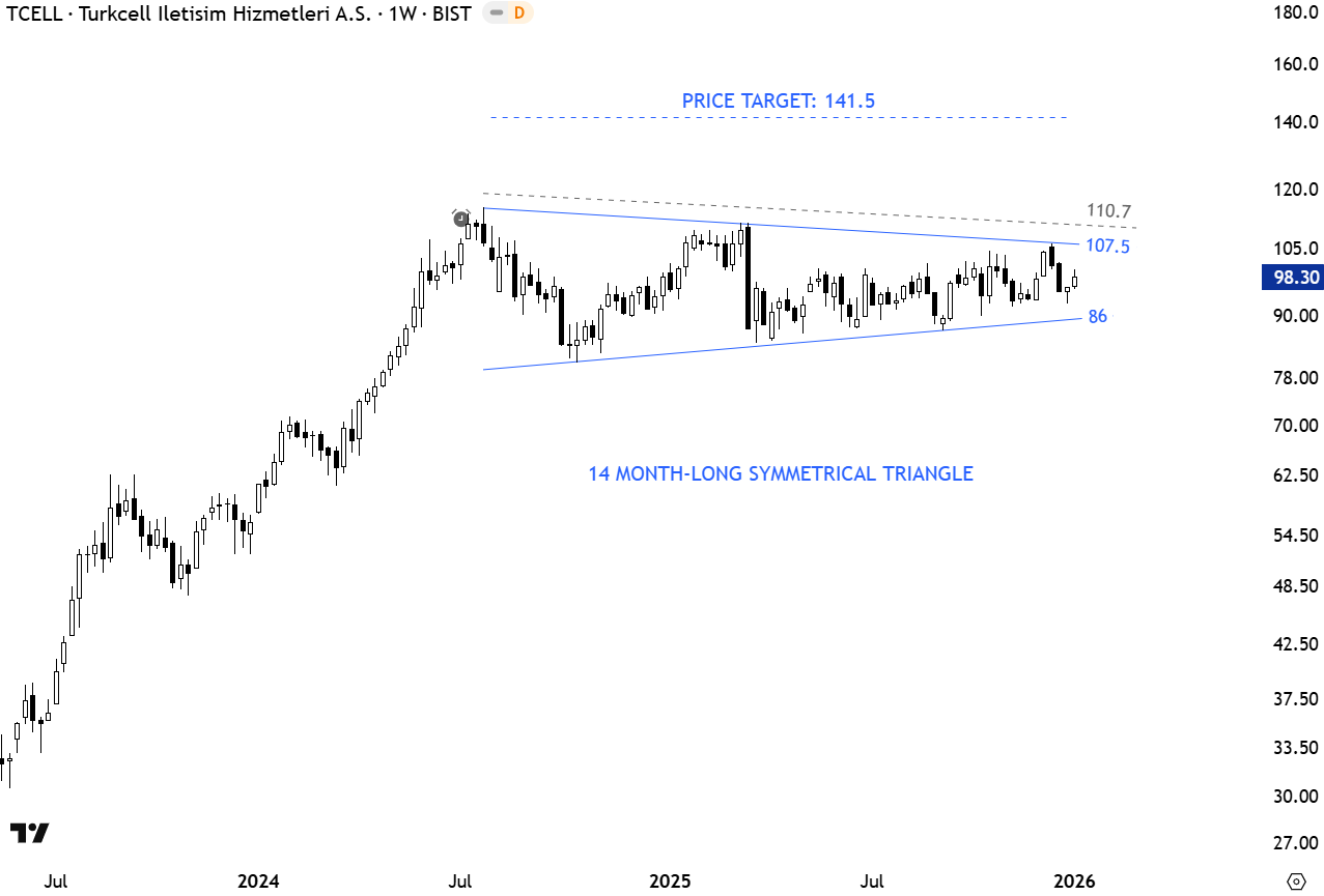Turkcell Iletisim Hizmetleri AS is engaged in establishing and operating a Global System for Mobile Communications (GSM) network in Turkey and regional states. The stock is listed on the Istanbul Stock Exchange. Price chart formed a 14 month-long symmetrical triangle with the upper boundary acting as resistance at 107.5 levels. A daily close above 110.7 will confirm the symmetrical triangle as a continuation with the price target of 141.5 levels. (Learn more: Video Tutorial)