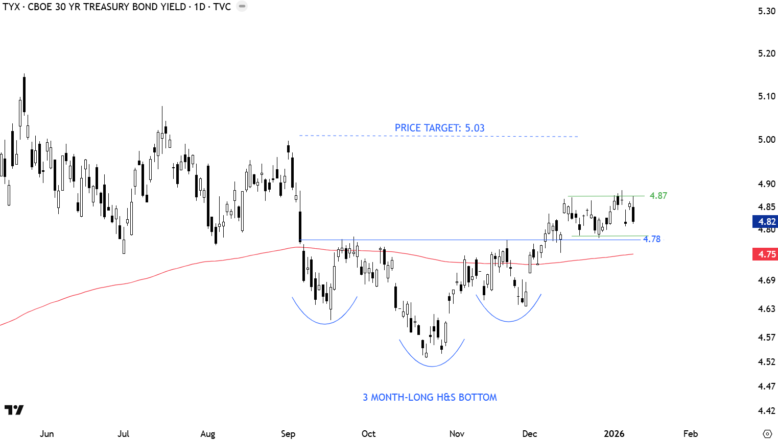 Between different duration U.S. yields, the 30 Year has the better defined chart pattern, a possible 3 month-long H&S bottom completing on the upside with the breach of the neckline at 4.78 levels. Failure to hold above the 200-day average can put the bullish interpretation in question. Price target for the H&S bottom reversal stands at 5.03 levels. So far price action looks like a breakout followed by a pullback to the neckline.