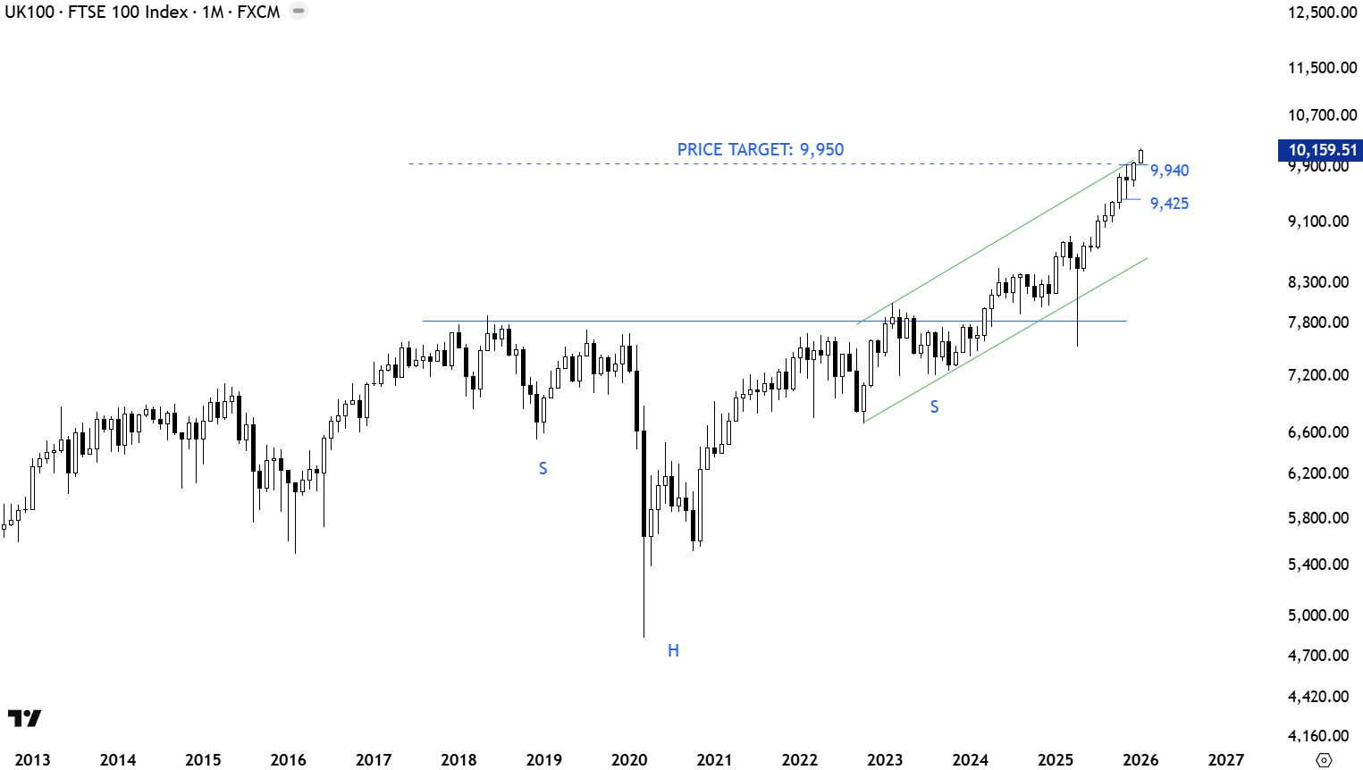 The long-term price chart of UK FTSE 100 Index completed a multi-month long H&S continuation chart pattern. The horizontal resistance was the neckline at 7,750 levels. This is a monthly scale price chart. Outlook is still positive for UK equities. 7,750 levels continue to be an important long-term support. Uptrend met the long-term price objective at 9,950 levels.