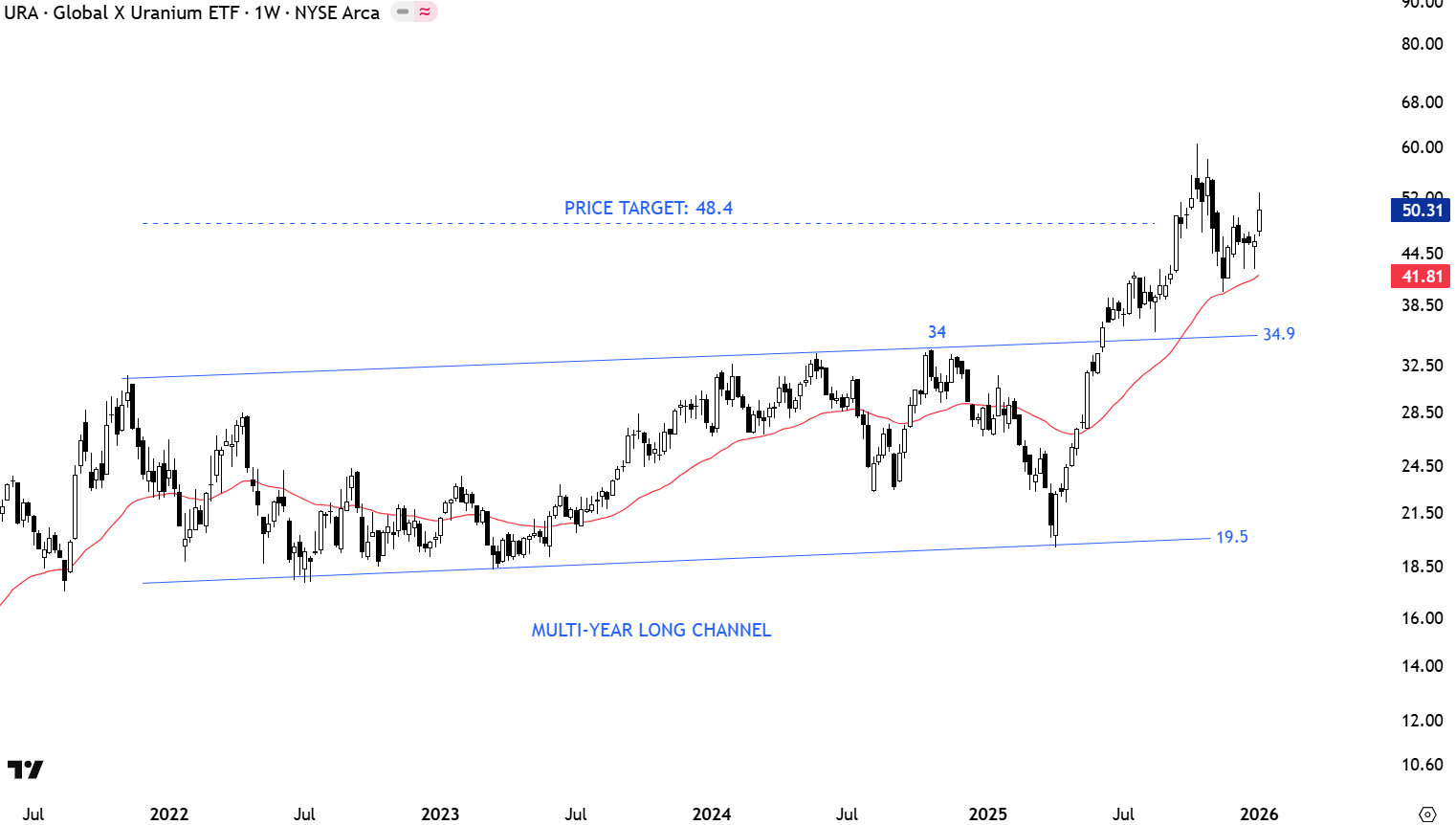 Global X Uranium ETF (URA) completed a large scale ascending triangle or a channel. Price broke out of its wide trading range between 19.5 and 34.9 levels. Breakout above 34-34.9 area completed a multi-year long ascending triangle (or channel) with the price target of 48.4 levels. 34-34.9 area turns into support. After a quick pullback to the pattern upper boundary, price rallied to chart pattern target at 48.4 levels. Uptrend is intact. URA can consolidate earlier gains above the long-term average. So far price action can be analyzed as a reversion to the mean.