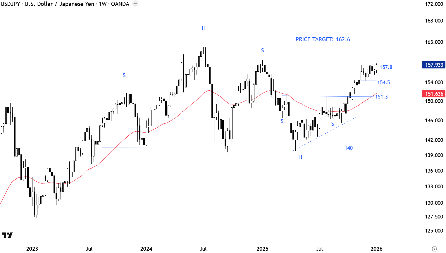 USDJPY has 2 possible H&S chart patterns over the past 2 years. A long-term H&S top with the neckline at 140 levels and a H&S bottom reversal (short-term) with the neckline at 151.3 levels. Price is trending above the 200-day average and I have been looking for a bullish chart pattern completion. Breakout above 151.3 levels confirmed the H&S bottom with the price target of 162.6 levels. Such price action favoring USD strength can also result in a H&S top failure. 151.3 level becomes the new support. A short-term consolidation between 154.5 and 157.8 levels can act as a bullish continuation as the pair targets 162.6 levels.