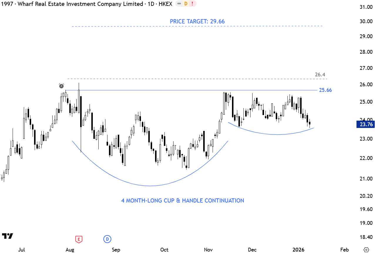 Wharf Real Estate Investment Co. Ltd. is an investment holding company, which engages in investment in strategic and substantial retail, office, and hotel operations. It operates through the following segments: Investment Properties, Development Properties, Hotels, Investment, and Others. The stock is listed on the Hong Kong Stock Exchange. Price chart is possibly forming a 4 month-long cup & handle continuation with the horizontal boundary acting as resistance at 25.66 levels. A daily close above 26.4 will confirm the breakout with the possible chart pattern price target of 29.66 levels. (Learn more: Video Tutorial)